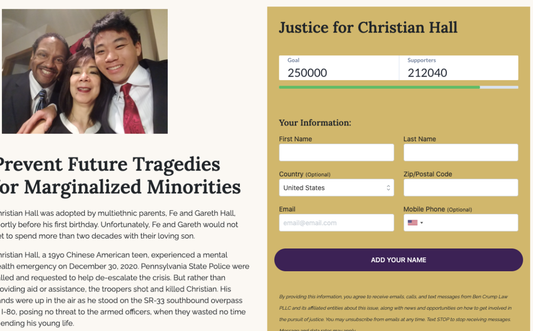 编者按:2020 年 12 月 30 日,亚裔男性陈智博在宾州被警察枪杀,成为又一名疑似因执法不规范而死于警察枪口下的无辜年轻人,而这件事也引起了华裔社区极大的关注和讨论。本周,去年 5 月当街杀死乔治 · 弗洛伊德的警察肖恩被判有罪,意味着社会在打击警察滥用暴力问题上取得了阶段性的进步。为乔治 · 弗洛伊德发声寻求正义的律师 Ben Crump 代理了陈智博的案件后,与陈智博的父母一起在社区中为这起事件发声。让我们通过本篇文章,一起来了解一下自案发以来到 2021 年 4 月他们都做了什么,属于陈智博的正义又何时才会到来?