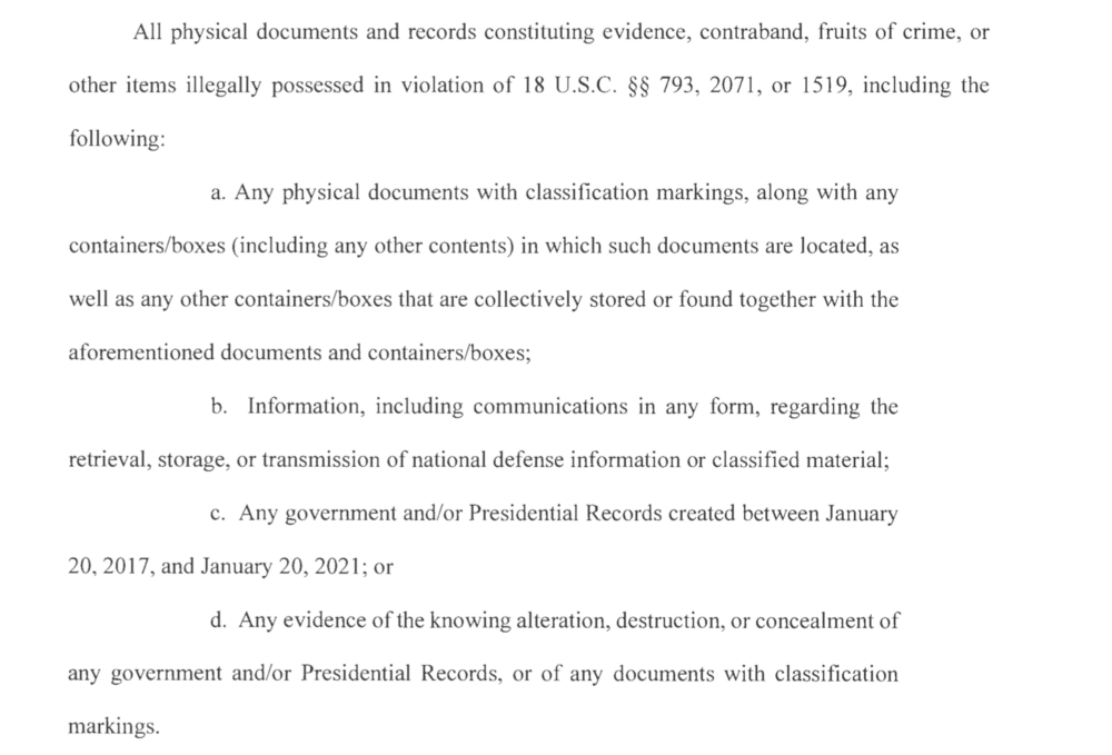 搜查令里面列出的川普可能触犯的法律条款