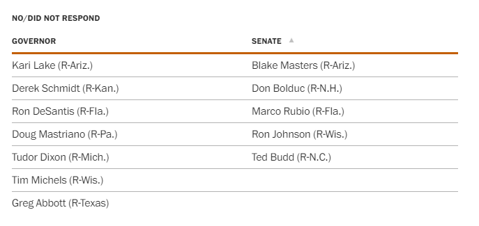 在亚利桑那州、佛罗里达州、堪萨斯州、密西根州、新罕布什尔州、北卡罗来纳州、宾夕法尼亚州和德克萨斯州的州长或参议员竞选中,共和党候选人拒绝表示他们会接受今年的选举结果。根据《华盛顿邮报》的分析,除了威斯康星州现任参议员罗恩·约翰逊(Ron Johnson)和佛罗里达州现任参议员马尔科·卢比奥(Marco Rubio)之外,其他所有共和党候选人都公开接受了川普关于2020年选举舞弊的虚假说法。